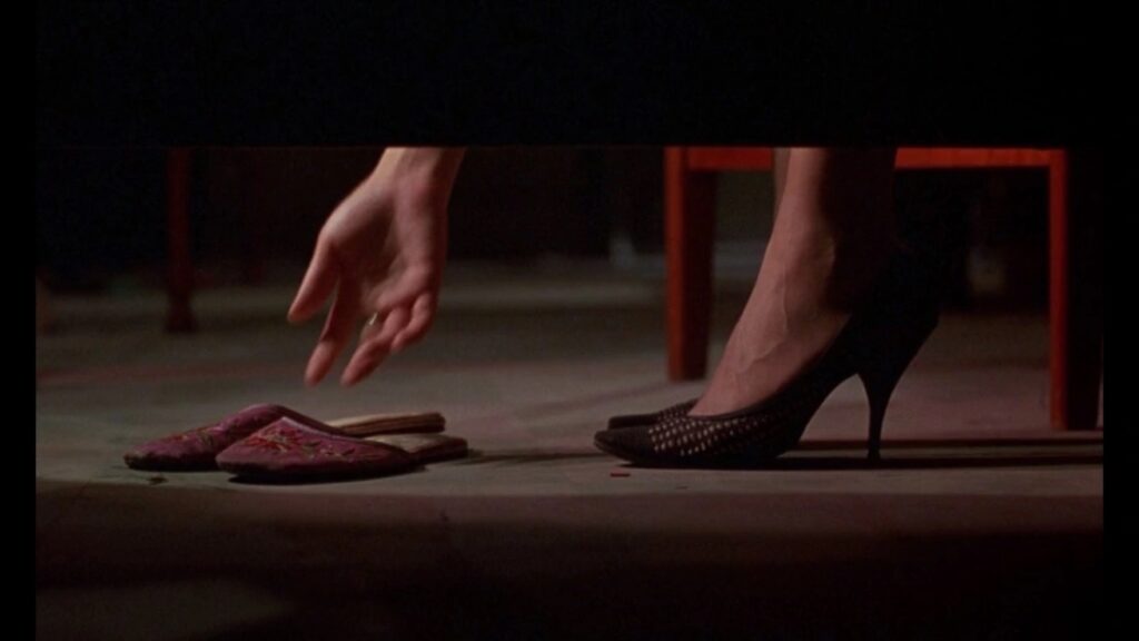 In a similar vein, when she finds herself in Mr. Chow’s room late at night, Mrs. Chan is compelled to spend the night when their neighbours return unexpectedly early, leaving them no time for her to exit his room without seeming suspicious. All that was going on within the confined space of the bedroom was that she was reading his manuscript; later, when ‘trapped’ there, they do not even share a bed. The next day, she slips out wearing his wife’s shoes, leaving her velvet house slippers behind so as not to attract unwanted attention or raise suspicion about the two of them. The slippers are a recurring article of clothing: they reappear later in Mr. Chow’s room when he moves to Singapore. Mrs. Chan leaves them secretly in his apartment, perhaps to remind him of their only night together, however innocently spent, and then, almost as an afterthought, ferrying them away again. ‘There’s nothing between us,’ she says, ‘but I don’t want gossip.’