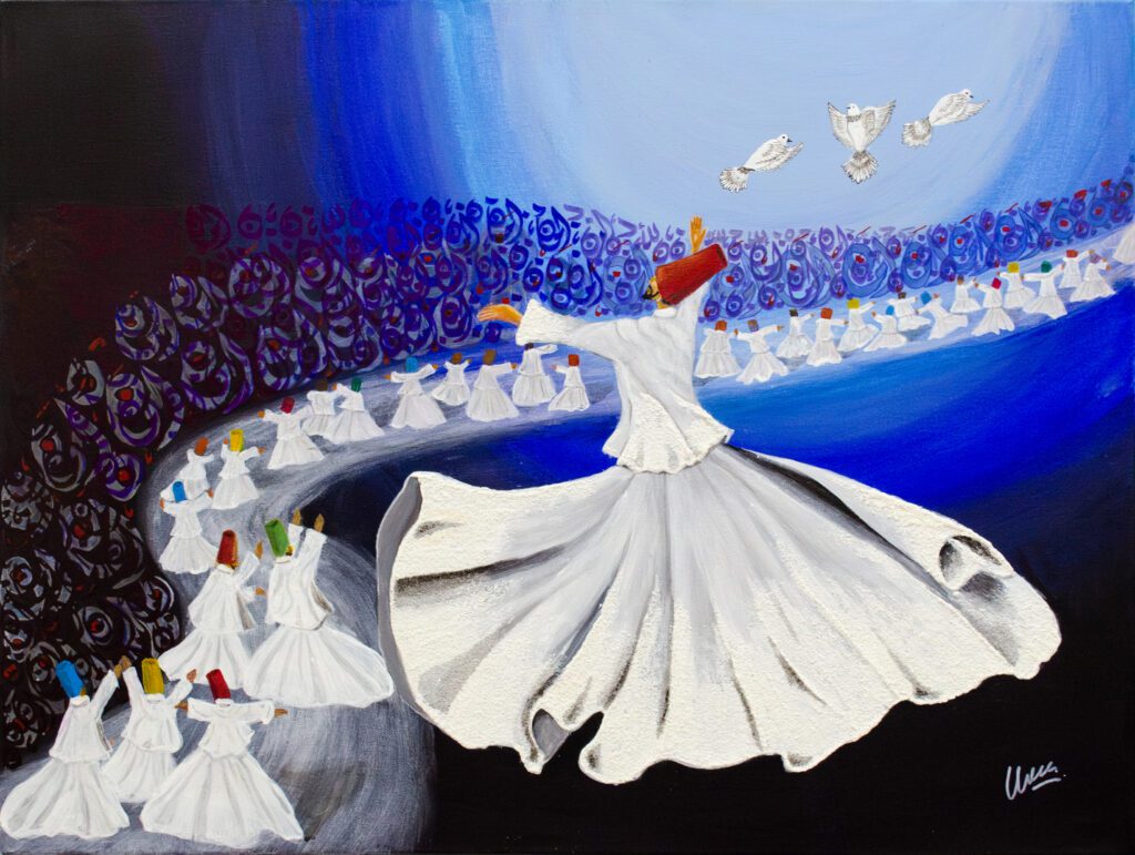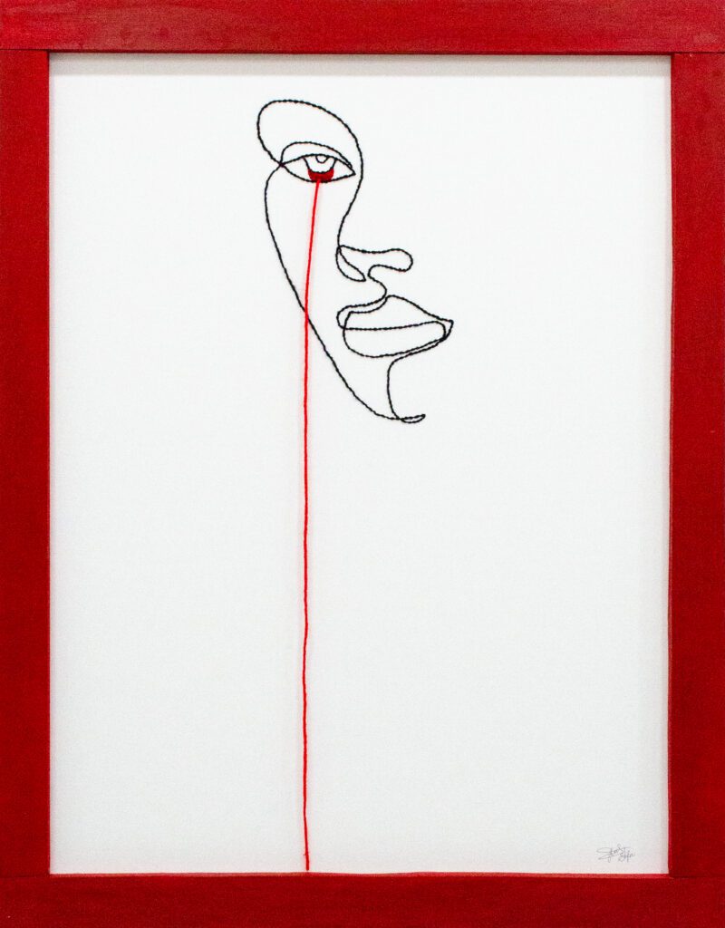 A woman waits for a son, a husband, and a brother to return in Nour Aldeen Salem’s painting, ‘Diaspora.’ Her black and white image caresses a belly mapped out in droplets of red for the far-away sites bottling up her only blood type. She symbolises, as Salem puts it, “the greatest suffering of all” in a world inundated with forced choices. In the artist’s home Syria, male counterparts often face compulsory military service, urging them to move elsewhere. Salem found out he had to enlist to fight in a war just 15 days before… His mother waits, for 10 years, hoping her son will visit.