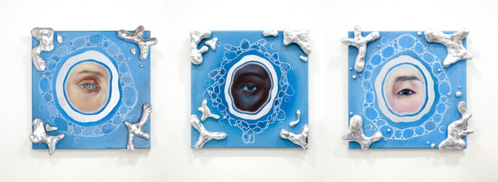 An astronaut floats in the middle of four hands where an alien sits, facing this astronaut. Behind this astronaut is a perfected man who celebrates a victory– a 13-year transit through assimilation. Except, they are all in white. Zadeh’s ‘Crossing Borders’ reflects the many perspective’s of one man’s journey through migration but most of all, depicts the sense of alienation from not just his surroundings but his being as well with the purposeful use of white acting as a blank canvas of sorts, a void. Zadeh explains,“Becoming a refugee was a means to an end. We know we cannot return to our country of origin but when we enter here, we cannot help but be distracted by the fact that we are finally safe from the place we are running away from. We think we are safe because if we are running away from conflict if we are running away from persecution… But the longer we stay here, we realise that there are issues in and of being a refugee in Malaysia. That slowly chips away at the concept of hope as we know it.”