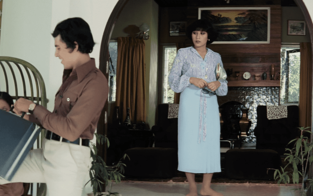 Through these two statements, the point is clear: the homogeneity between film and costume to tell a story is an obvious one. Just as obvious, is Malaysia’s favorable film genre: Melodrama. A genre that through its fantastical imagery and expressive characters gives us a means of seeing and understanding the world of its time. Jins Shamsuddin’s Tiada Esok Bagimu is no stranger to that. Released during Malaysia’s peak liminality into modernity in the early 1980s, the film tackles the goals of westernisation while trying to keep in line with the Malay and Islamic National Identity. Like each shot in the movie, each dress is semiotic of the times presented.