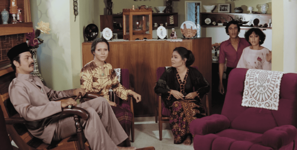As the film progresses, its attempt to reveal the weaknesses of the Malaysian upper class (a family of lawyers, architects, and a minister) is evident. At the beginning of the film, we see Ghazlan sporting a shirt and trousers when the secretaries at his office make a comment about him always staying late at work. He later arrives home for his daughter Noraimy’s birthday and accidentally reverses his car on to her––a critique of his mixed priorities, westernised lifestyle, and neglect of tradition that has resulted in an unfortunate event.
